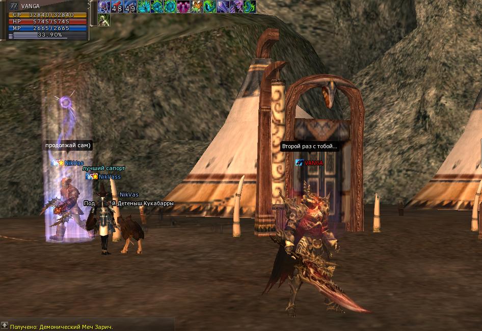 Шанс дропа и введение • Все монстры в мире могут дропнуть его, хотя только один из них существует в целом мире. • Невозможно выбросить, передать или уничтожить этот меч. • Когда Zariche появляется в мире, весь мир ненадолго покрывается тьмой, твердь земная содрогается, и системное сообщение уведомляет игроков, что демонический меч найден. • Персонаж, подобравший Zariche, мгновенно переходит в хаотическое состояние(красный ник) и его(её) HP, CP и MP полностью восстанавливаются(100%). • Как только меч получен, карма персонажа становится максимальной. Пока Zariche не покинет персонажа, он всегда будет иметь карму. • Когда персонаж получает Zariche, тот автоматически «одевается» и его невозможно «снять». • Zariche автоматически исчезает через некоторый промежуток времени. • Когда персонаж, владеющий Zariche, умирает, меч немедленно исчезает или выпадает на землю. • Zariche автоматически покинет своего владельца в соответствующее время независимо от того, является ил игрок онлайн или нет. • Персонаж, владеющий Zariche, будет уведомлён системным сообщением о том, сколько времени осталось до исчезновения Zariche. Войны и партии Следующие правила действую на персонажа, владеющего Zariche, в ПвП, клан-варах и партиях. • Игрок, владеющий Zariche, не может атаковать игроков лвл20 и ниже. В свою очередь, игроки должны быть не ниже лвл21, чтобы атаковать персонажа, владеющего Zariche. • Когда наносишь удар(не считая скиллов и магии) игрокам, включая Героев, их CP мгновенно становится равным 0. • Когда Герой бьёт(не считая скиллов и магии) игрока, владеющего Zariche, CP этого игрока мгновенно становится равным 0. • PK штрафы, такие как потеря опыта, дроп вещей, рост кармы и т.д., не будут применяться к обеим сторонам, если участвует игрок, владеющий Zariche. • Игрок, владеющий Zariche, не может вступать в партию к другим игрокам. • Если игрок получает Zariche, находясь в партии, то он автоматически из неё выходит. • Игрок, владеющий Zariche, не может использовать систему поиска партии(party matching system) или командный канал(command channel). • Игрок, владеющий Zariche, не может давать или получать баффы и не может лечить или быть вылеченным другими игроками. Однако он может использовать баффы или лечиться самостоятельно. • Игрок, владеющий Zariche, может призывать животных/суммонов, но не может ездить на животных. Олимпиада и Герои • Игрок, владеющий Zariche, не может участвовать в Олимпиаде. • Герой, получивший Zariche , всё равно может использовать скиллы Героя. Возможности и время жизни • Когда игрок, владеющий Zariche, убивает другого игрока, время жизни Zariche уменьшается, но способности меча растут. • Zariche заставляет владельца считать всех, участвующих в осаде, врагами. • Когда игрок, владеющий Zariche, умирает, меч выпадает, а его(меча) способности возвращаются к нормальным. |